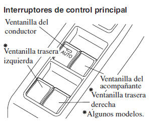 Para abrir la ventanilla a la posición deseada, presione hacia abajo el interruptor. Para cerrar la ventanilla a la posición deseada, levante el interruptor.